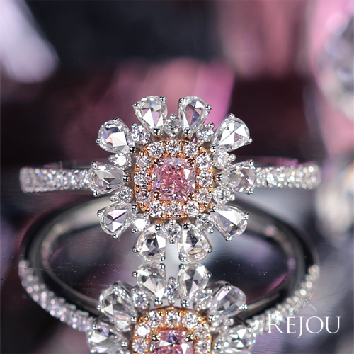 大粒!希少な高品質ピンクダイヤモンド(FIPP)VVS2がセンターに君臨! 取り巻くローズカットダイヤモンドの希少光彩にもご注目ください。 最高のピンク美彩を放つカリスマ・ハイジュエリーの誕生です。