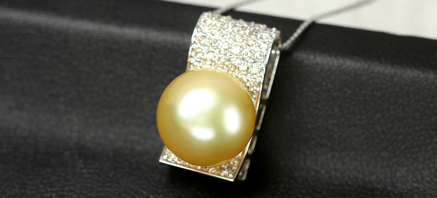 光りを反射して眩しく放つ大粒ゴールデンパールのテリとツヤが浮き立つように輝き