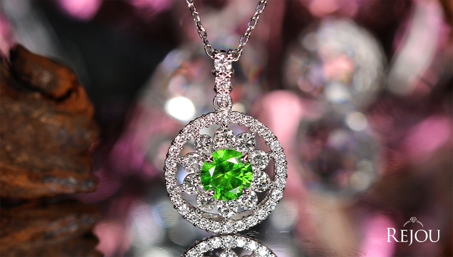 希少ロシア産デマントイドガーネットとデコルテを明るくライトアップします。