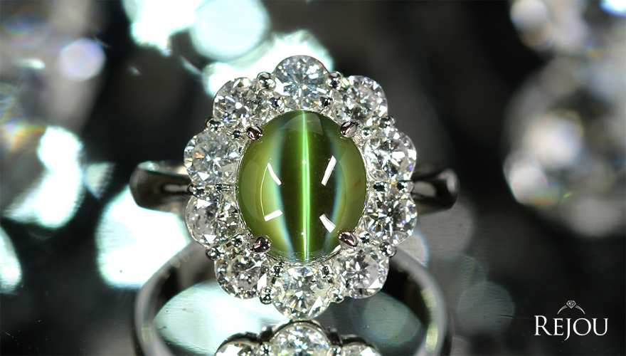 ![]() 大粒4.49カラット!気品と魅力にあふれたクリソベリルキャッツアイ。 艶やかなアップルグリーンと、石の端から端へと延びる太く長い猫目効果。 ハイクオリティのダイヤモンドで華やかに囲んだ魅力たっぷりのリングです。 ●メインストーンについて 美しいアップルグリーンカラー光彩のぷるぷるボディーは まるで月の輝きのような神秘光彩です。 隅から隅までまっすぐに伸びるシャトヤンシーも見事。 光源を追いかけるかのようにキャッツ部分が輝き動きます。 コロンとしたフォルムが美しい厚みのあるカボションカットですので、 最高ランクの素晴らしいキャッツアイ効果を存分に発揮している秀逸の1石です。 ●サイドストーンについて 大粒の高品質ダイヤモンドを花びらのようにあしらいました。 曇りない透明感を持つ、所見VSクラスのハイクオリティを厳選。 華やかなブリリアンスが、キャッツアイを美しくライトアップします。 ●デザインについて クリソベリルキャツアイの自然な美しさを最大限に引き出しました。 高品質ダイヤモンドが大きく開花し輝き、ゴージャス感を高めています。 人目を惹き、遠目からも華やかな存在感を放ちます。 プラチナ仕立てのアームも豪華で着けやすく指馴染みにも優れた極上のお仕立てです。 ●REJOUオススメポイント 何と大粒4.49カラット!石の端から端へと延びる太く長い猫目効果。 艶やかなアップルグリーンが上品な、クリソベリルキャッツアイ。 ハイクオリティのダイヤモンドで華やかに囲んだ、人目を惹くリングです。 光を当てると現れる、不思議なキャッツアイ効果をしっかりとご堪能して頂けます。 文句なしの彩とキャッツアイ効果を、一流職人が丁寧にお仕立てしました。 極上のキャッツアイをお探しの方に、ぜひともおすすめしたい逸品です。 ●アイテムスペック 材質…Pt950 重量…約7.0g リングサイズ…10番(±3番以内サイズ変更可) 最大幅…約14.8mm 厚み…約8.5mm 中石…クリソベリルキャッツアイ 4.49ct(約8.6×7.5mm) 脇石…ダイヤモンド トータル 1.193ct 商品状態・・・新品 ●宝石ランク 彩 … S A B C D 透明感 … F VVS VS SI I I2 カット… EX VeryGood Good Fair Poor キャッツアイ… S A B C D E 脇石… S A B C D E