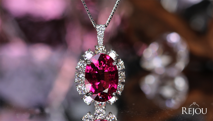 真っ赤な薔薇色の素晴らしい輝きを放つルベライトを、ダイヤモンドの輝きで包む重厚なネックレス。
