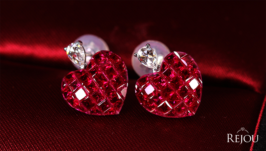 真っ赤なルビーのミステリーセッティング・ハートモチーフの上部には