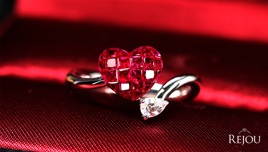 ハートの立体ルビー(ミステリーセッティング)のレッドファイアとの相乗光彩のために