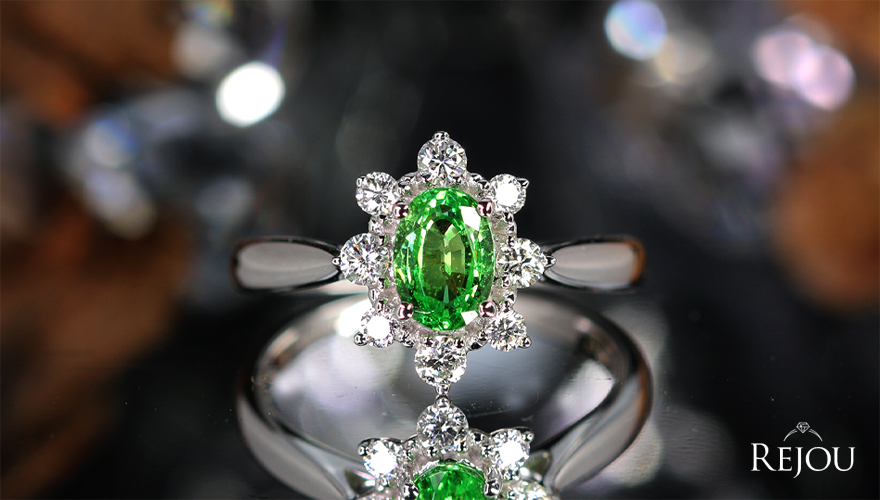 ![]() 強力なテリ艶と美しい緑の息吹! グリーンガーネット超美石が強烈な輝きを放つリング ダイヤモンドの向日葵のように光輝を纏った美ジュエリー ●メインストーンについて 生命力を鮮烈に描き出すようなトップカラーのグリーンガーネット超美石! どの角度から見ても鮮やかなグリーンカラーでテリ艶も強力です。 透明感も大変高いため、内部からより華やかな発色を放ちます。 バランスに優れたオーバルカット、ファセットから眩しい煌めきが広がります。 暗がりの下でも沈むことのない、自ら発光するかのような鮮烈な彩度は、 まさに自然界が創り上げた奇跡の色彩と言えるでしょう。 ●サイドストーン(ダイヤモンド)について メインのグリーンを神々しく引き立てるのは所見VSクラスの厳選された高品質ダイヤモンドだけ。 一石一石が鋭いブリリアンシーを放ち、まるで太陽光線の放射と照り返しのように、 眩いシンチレーションを周囲に振りまきます。 精緻なカットによって生まれる七色のファイアも 主石との鮮やかなコントラストを描き出す極上石ばかりです。 ●デザインについて グリーンガーネットをダイヤモンドで囲んだ、フラワーモチーフのデザインです。 生命力にあふれる向日葵のように放射状に高品質ダイヤモンドの輝きを配置したデザインは ジュエリー全体の品格を格段に押し上げています。 鮮やかなグリーンガーネットとダイヤモンドのコントラストで相乗で輝き合う迫力も 生命力あふれる光彩が広がり、指もとが誇らしくなるほどの美しさです! アーム部分はあえてシンプルに、かつ滑らかな曲線を描くよう設計されており、 指先にしなやかにフィットする極上の付け心地を追求しました。 それでいて視線を惹きつけるプロポーションで、あらゆる世代の方に愛される普遍的な美しさを宿しています。 ●REJOUオススメポイント 強力なテリ艶と美しい緑の息吹! 鮮やかなグリーンが人目を惹く、華麗なグリーンガーネットのリング。 ダイヤモンドが豪華に輝き、大きな存在感を放つデザインです。 輝く向日葵のように光輝を纏った美ジュエリーとして 瑞々しい生命の輝きを放つグリーンガーネットとダイヤモンドが輝き続ける逸品です。 ●アイテムスペック 材質…K18ホワイトゴールド 重量…約3.2g リングサイズ…11番(±3番以内サイズ変更可) 最大幅…約12.0mm 厚み…約6.0mm 中石…グリーンガーネット(ツァボライト) 0.80ct(約6.6×4.5mm) 脇石…ダイヤモンド トータル 0.28ct 商品状態・・・新品 ●宝石ランク 彩 … S A B C D 透明感 … F VVS VS SI I I2 カット… EX VeryGood Good Fair Poor 脇石… S A B C D E