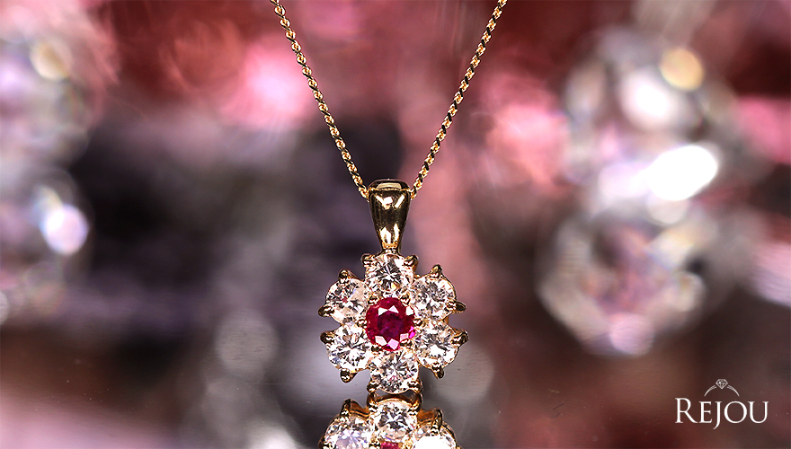 ![]() デコルテに咲く情熱の華、鮮美なルビーの輝き。 華やかなゴールド仕立てと気品あふれる真紅の彩り。 日常をドラマティックに彩る、至高のフラワージュエリー。 ●メインストーンについて 中央に鎮座するのは、濃厚で艶やかな発色が魅力の天然ルビーです。 イエローゴールドと相性の良い、力強く深い赤色が視線を惹きつけます。 石の奥底から湧き上がるようなネオン感が、生命力豊かな煌めきを演出。 美しいカットが施され、ルビー特有の瑞々しいテリを最大限に引き出しています。 一目で品質の良さが伝わる、色乗りが良く透明度に優れた一石をセレクトしております。 ●サイドストーン(ダイヤモンド)について メインを囲むのは、所見VSクラスの高品質な厳選ダイヤモンドです。 一石一石が放つ強いブリリアンシーは、淀みのない純粋な白光の証。 高品質ダイヤモンドを厳選しているからこそ実現した、極上の煌めきです。 ●デザインについて ルビーを花芯に見立て、ダイヤの花びらが咲き誇るエレガントな造形。 18金イエローゴールドの華やかな光沢が、クラシカルな美しさを強調。 バチカン部分にも厚みを持たせ、高級感のあるシルエットを追求しました。 デコルテに馴染むサイズ感ながら、美しいルビーとゴールドの華やぎが目を惹きます。 細部まで拘り抜かれた意匠が、ジュエリーとしての完成度を高めています。 ●REJOUのオススメポイント 情熱と愛の象徴であるルビーが、身に着ける人の内なる美しさを際立たせます。 厳選されたルビーとダイヤモンドとイエローゴールドの対比も美しく 時代に左右されないデザイン美を兼ね備えた逸品です。 REJOUならではのクオリティと特別価格で貴女にお届けいたします。 ●アイテムスペック 材質(トップ/チェーン)…K18イエローゴールド 重さ…約1.8g チェーン長…約45cm(スライドアジャスター付き) チェーン太さ…約0.6mm 寸法・厚み(バチカン含む)…約12.0×8.3×3.8mm チェーン取り外し…可 中石…ルビー 0.15ct(約2.5×2.5mm) 脇石…ダイヤモンド トータル 0.45ct 商品状態・・・新品 ●宝石ランク 彩 … S A B C D 透明感 … F VVS VS SI I I2 カット… EX VeryGood Good Fair Poor 脇石… S A B C D E